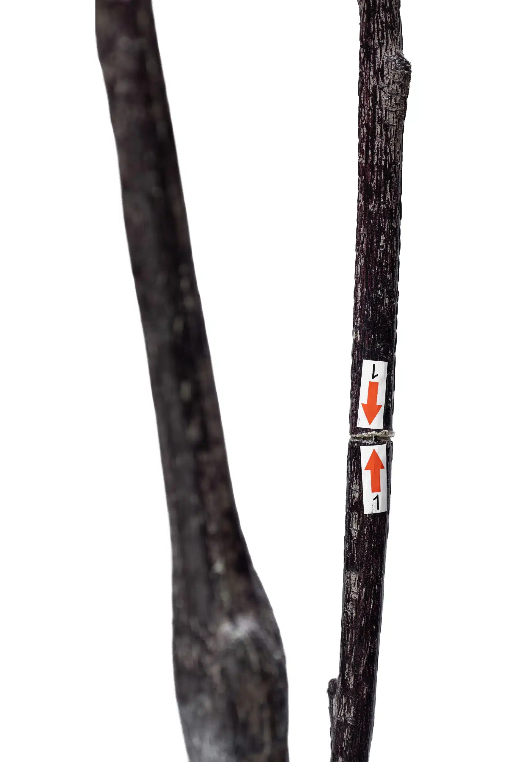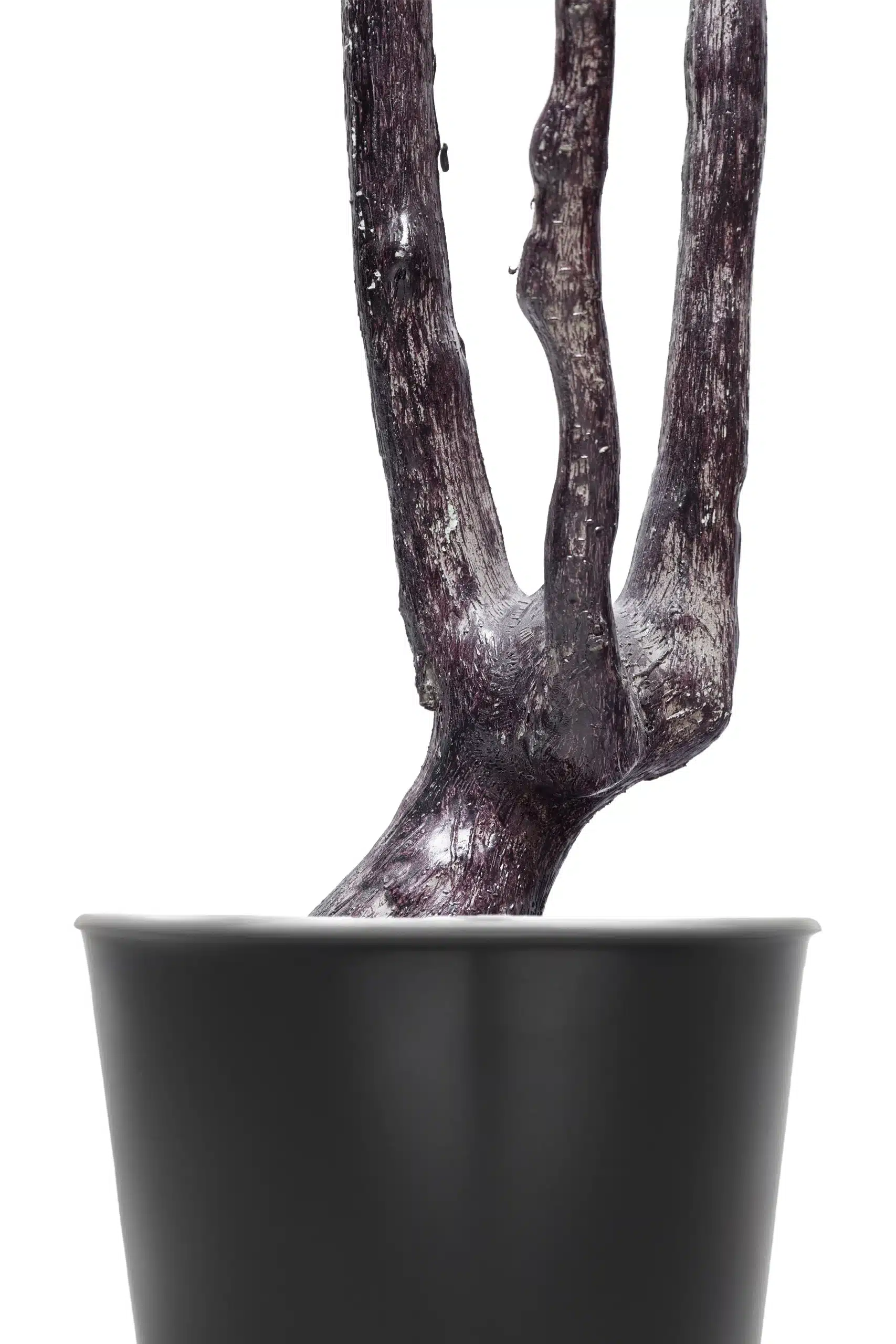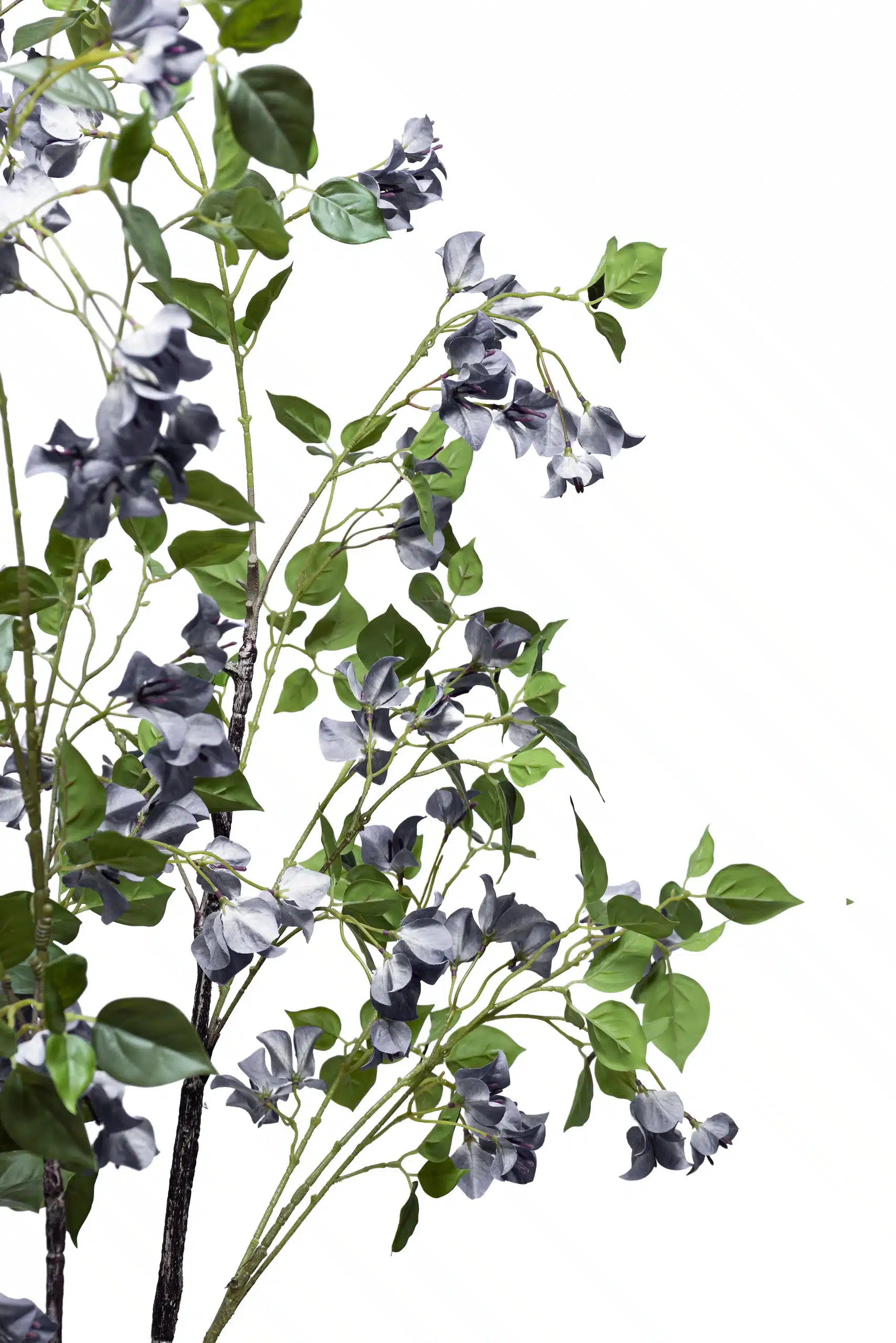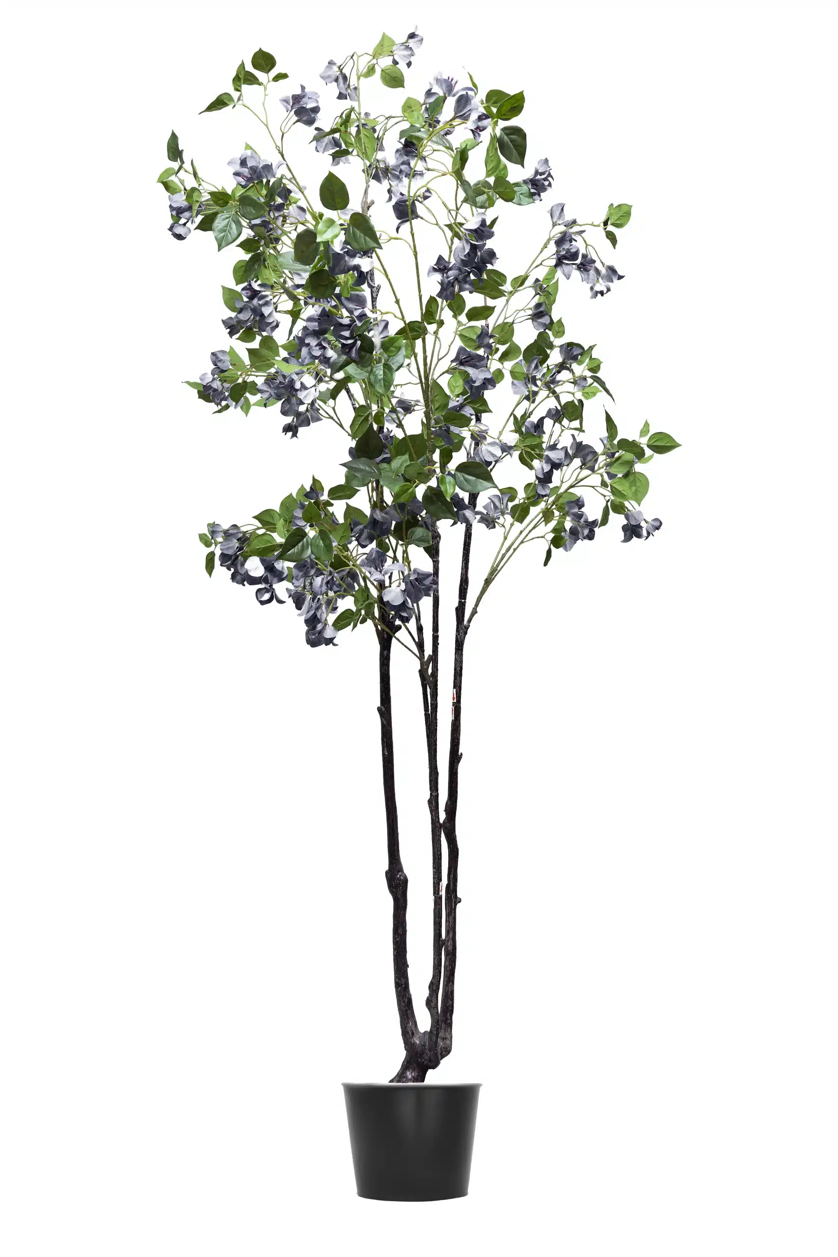 This is an artificial bougainvillea plant with purple flowers. The plant has a somewhat slender, upright form with several main stems that have a dark, reddish-brown, textured finish to look like real wood. From these stems, branches extend, covered in a mix of dark green, oval-shaped leaves and clusters of papery bracts in a vibrant purple hue. The plant is situated in a simple, dark container, creating a clean, decorative piece that mimics the appearance of a naturally blooming bougainvillea.