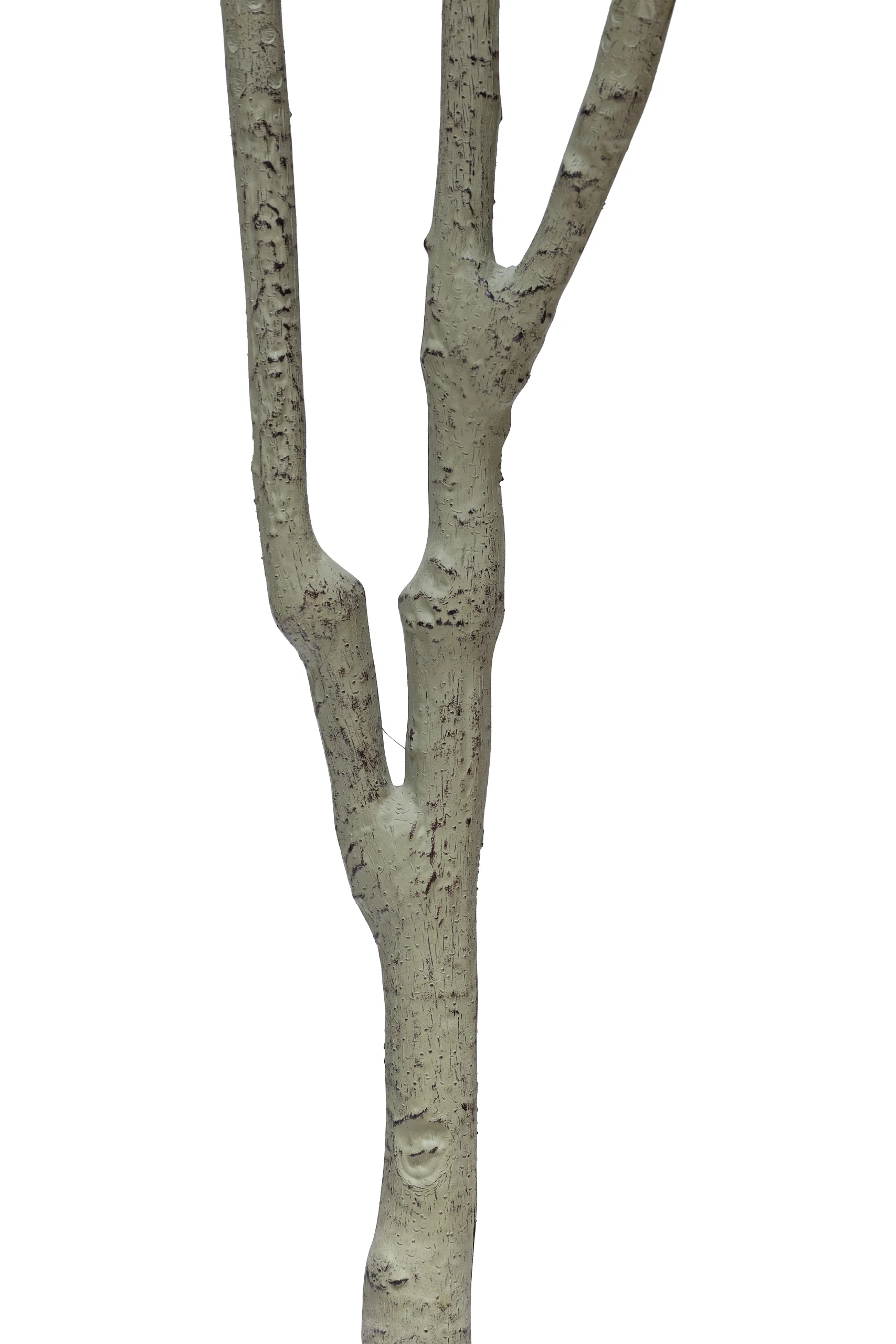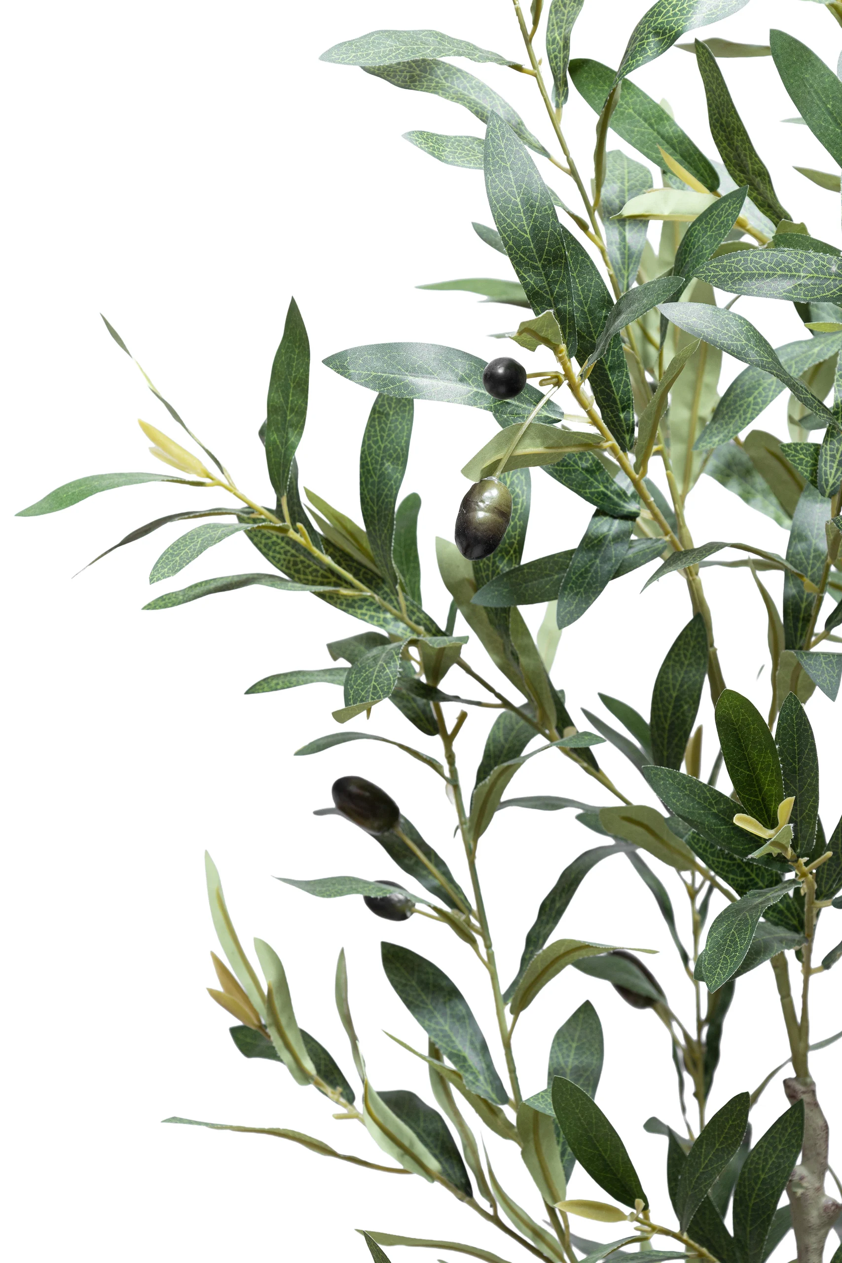This is an elegant artificial olive tree, a timeless accent for any home or office decor. It features a slender trunk with a natural, light gray-brown texture that mimics authentic bark. The trunk gracefully divides into multiple branches, supporting a generous canopy of narrow, silvery-green leaves. Tiny black “olives” are scattered among the foliage, adding a realistic touch. The tree is securely potted in a modern black container, creating a sophisticated and low-maintenance piece that captures the serene beauty of the Mediterranean landscape.