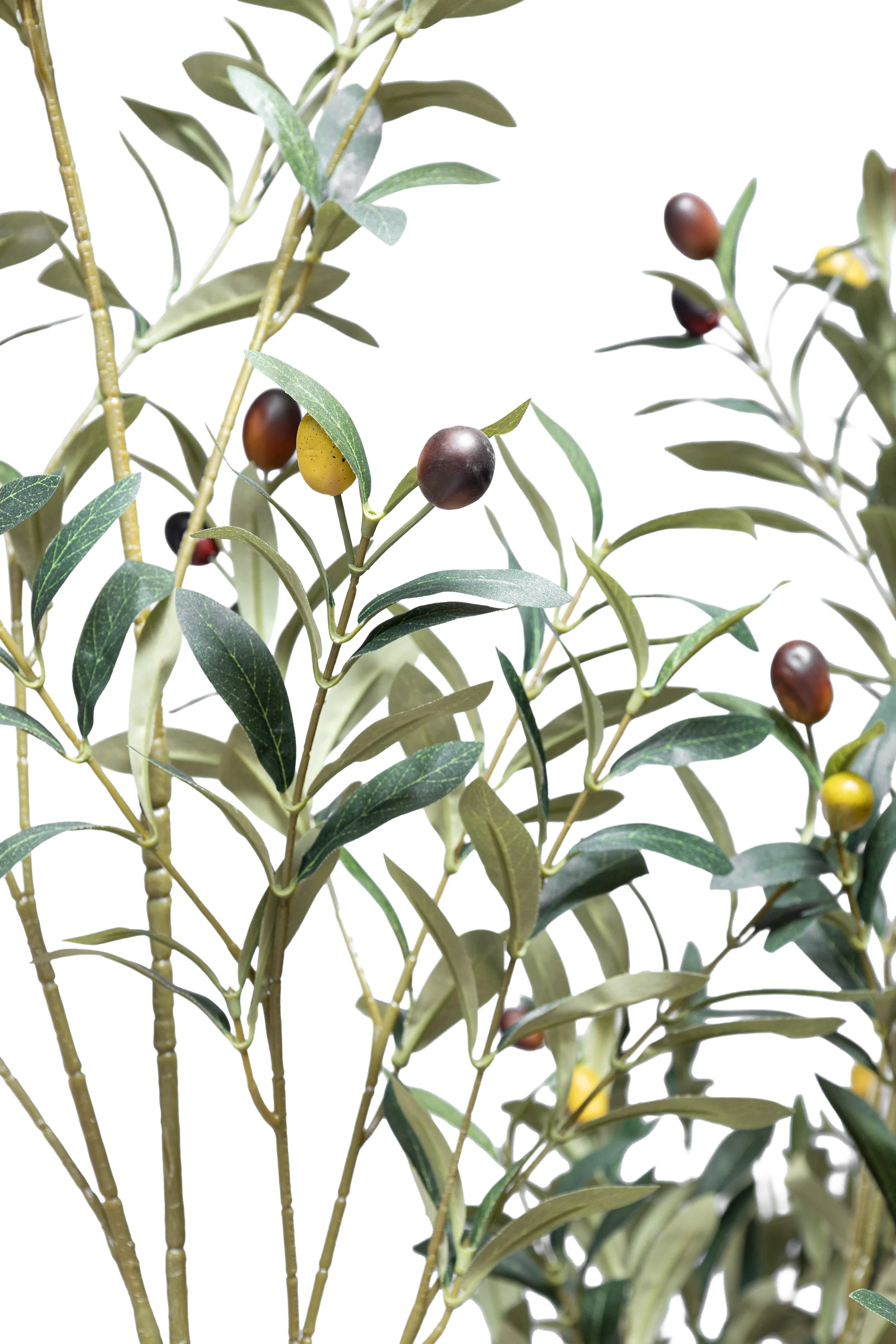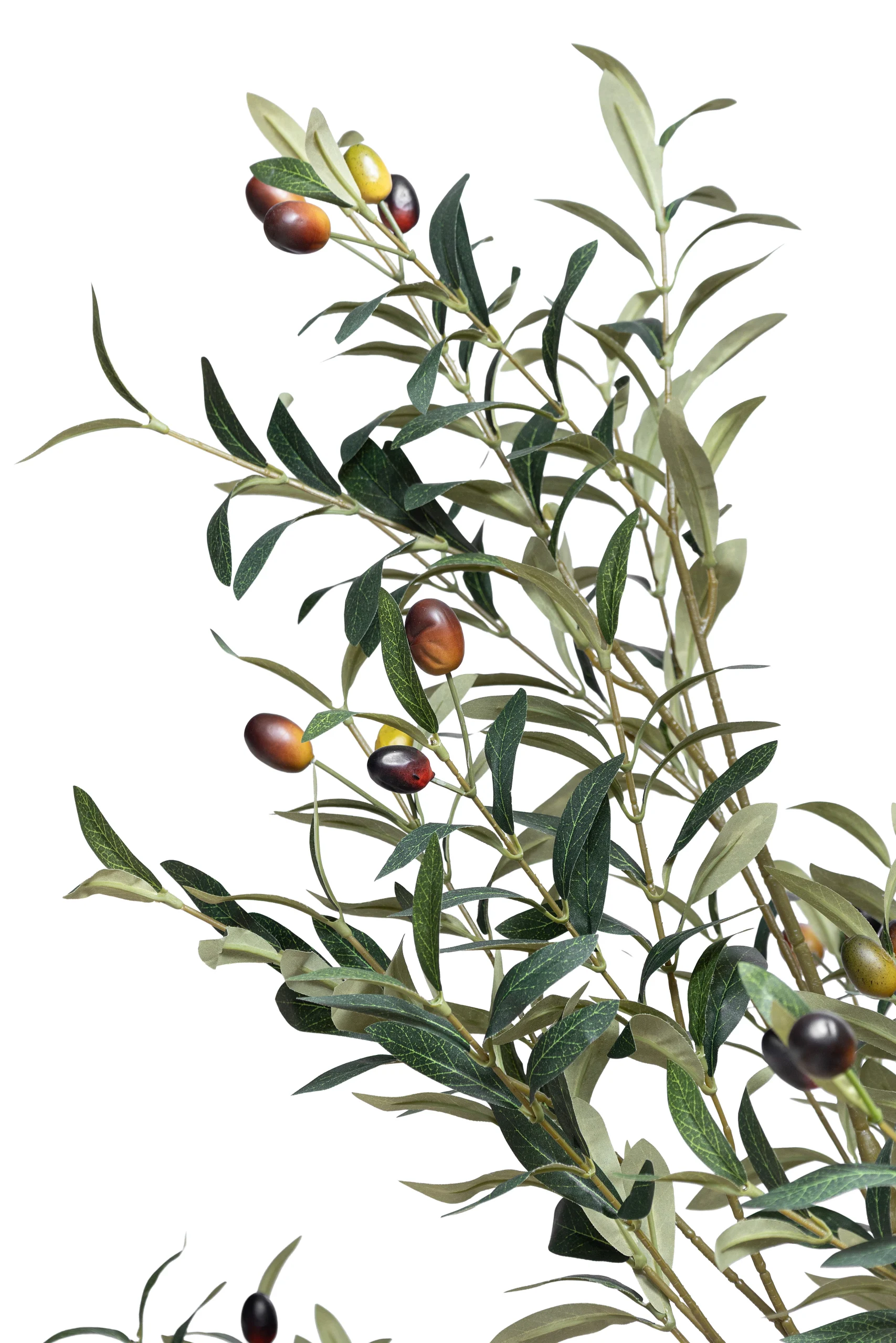 This is a beautiful artificial olive tree, designed to bring a touch of timeless elegance to any indoor space. The tree features multiple slender trunks with a light, natural texture, creating a realistic and rustic feel. A full canopy of narrow, silvery-green leaves branches out, their muted color and slight sheen perfectly mimicking a living olive tree. Small, dark “olives” are interspersed throughout the foliage, adding a realistic detail. Potted securely in a clean, black container, this tree provides a sophisticated and low-maintenance decorative accent.
